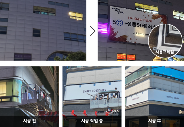 건물 손상 없이 넓은 벽면을 활용해서 눈에 띄는 대형 홍보 효과를 노릴 수 있습니다.