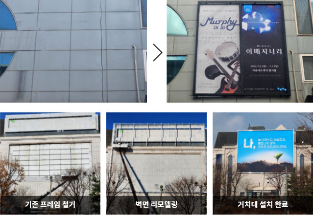 건물 손상 없이 넓은 벽면을 활용해서 눈에 띄는 대형 홍보 효과를 노릴 수 있습니다.